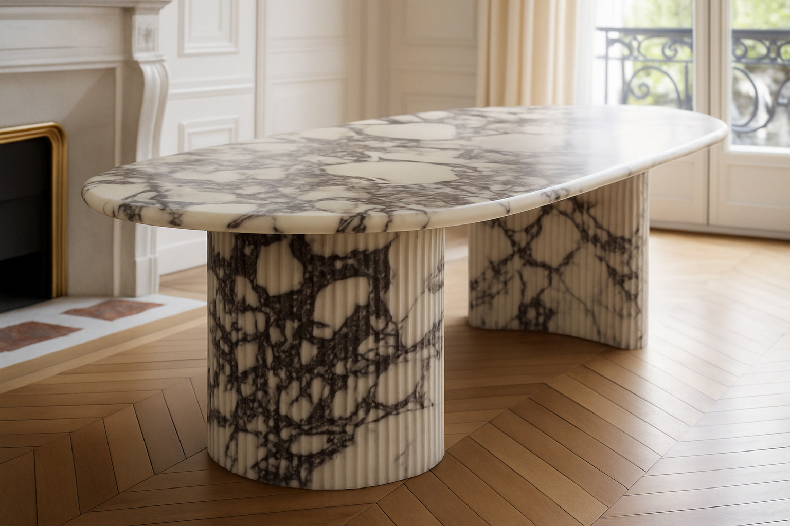 Sleek and sophisticated, this dining table is crafted from Grey Calacatta marble, showcasing elegant silver veining over a soft dove-grey base. With its refined texture and cool tones, it blends modern minimalism with timeless luxury — a perfect balance of restraint and opulence.