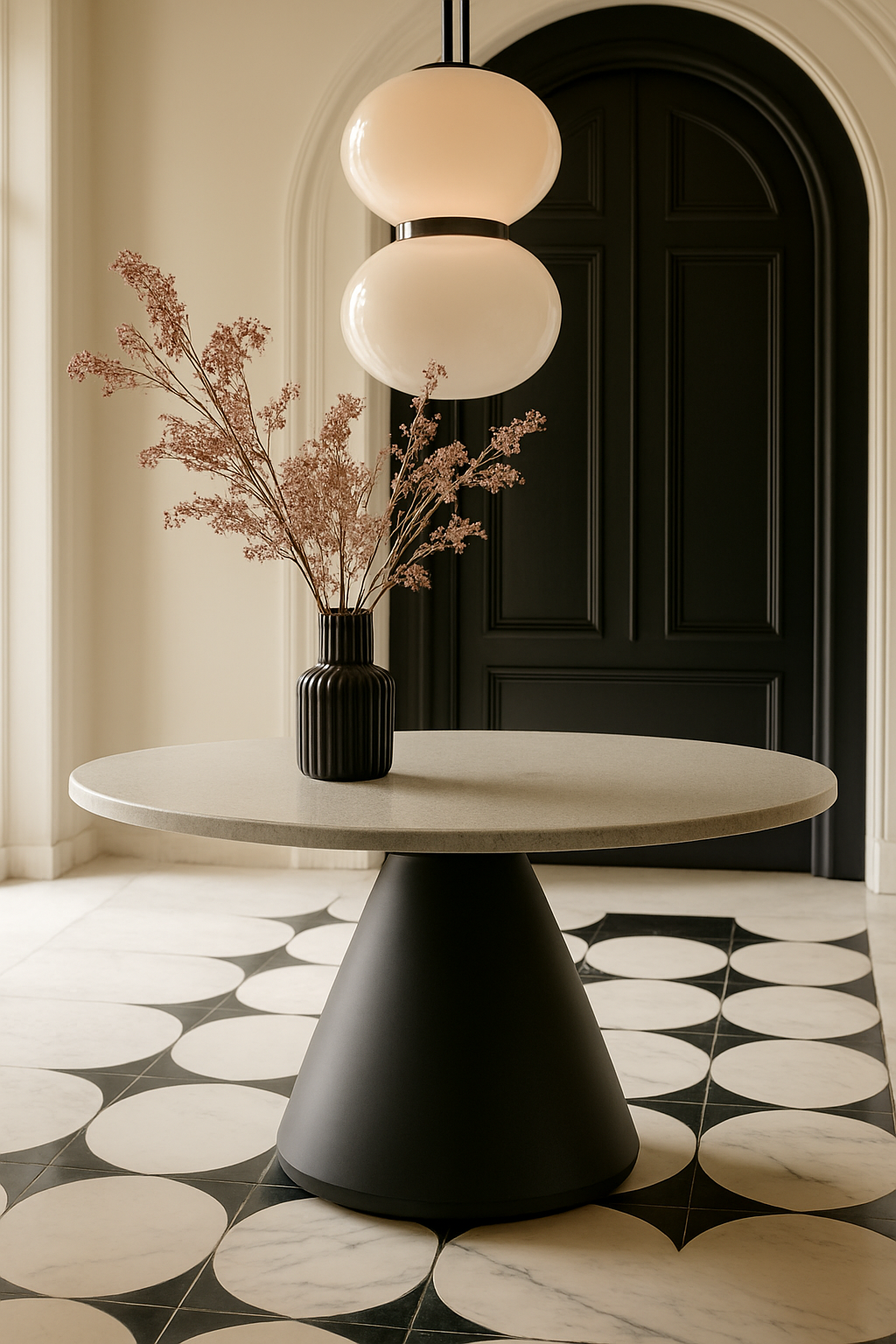 The LUMORA Table captures the essence of modern refinement — a harmony of form, texture, and light. Its perfectly balanced design pairs a soft, matte stone top with a bold, conical base in deep black, creating a striking contrast that feels both architectural and serene. The table’s minimal silhouette is elevated by its play of light and shadow, making it a sculptural centerpiece in any space. Ideal for refined dining areas or grand entryways, the LUMORA Table embodies contemporary elegance and timeless sophistication.