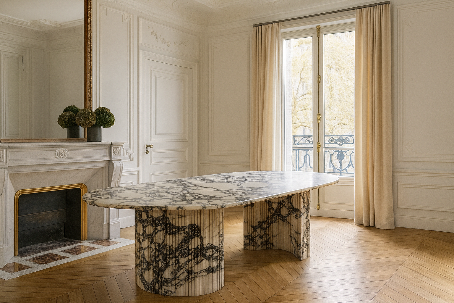 The Aurelia Marble Table is a statement of timeless elegance, crafted from exquisite marble with striking natural veining that turns each piece into a work of art. Its elongated oval top rests upon sculptural pedestal bases, merging strength with refined design. The soft curves of the structure contrast beautifully with the bold black and white marble patterns, making it a centerpiece that exudes both luxury and modern sophistication. Perfect for a grand dining room or an elegant meeting space, this table embodies the harmony of natural stone and architectural form.