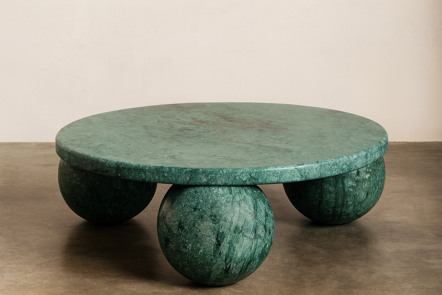 This stunning marble table features a smooth round support, crafted in lush green tones veined with deep black. Its sculptural form exudes harmony and balance, blending natural richness with modern artistry. Verde Orbit is a statement of bold minimalism—where organic texture meets timeless design.